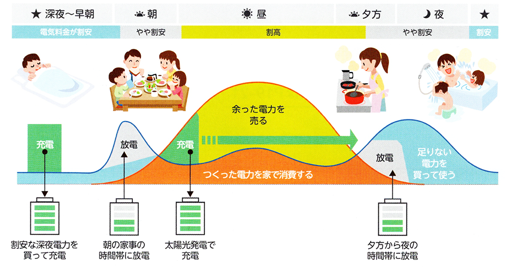 蓄電池システムは、日中に太陽光発電で作った電気を蓄電します。その電気は、使用料の多い夕方から夜にかけて使用し、買う電気を減らします。さらに、割安な深夜電力を蓄電し、朝の時間にその割安な電気を使うことで、経済性をアップさせる機能もあります。