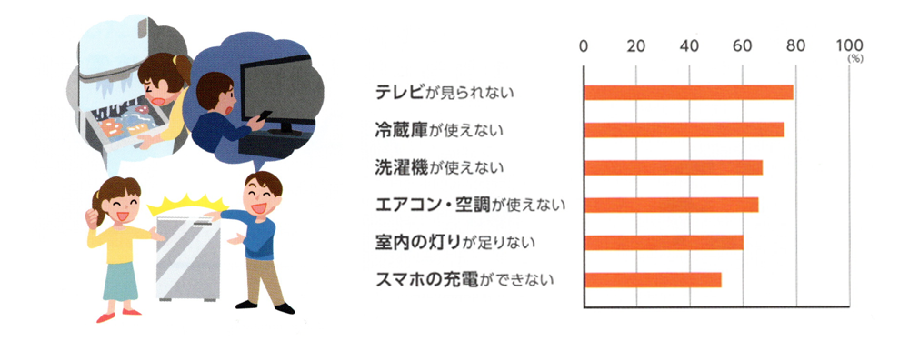 テレビやスマートフォンによる災害情報の入手が困難になったことや、冷蔵庫の食材がダメになったり生鮮品の備蓄ができないといったことが伝えられました。また、災害が夏や冬に起きた場合、空調が使えないことで体調を崩しやすくなることも心配です。